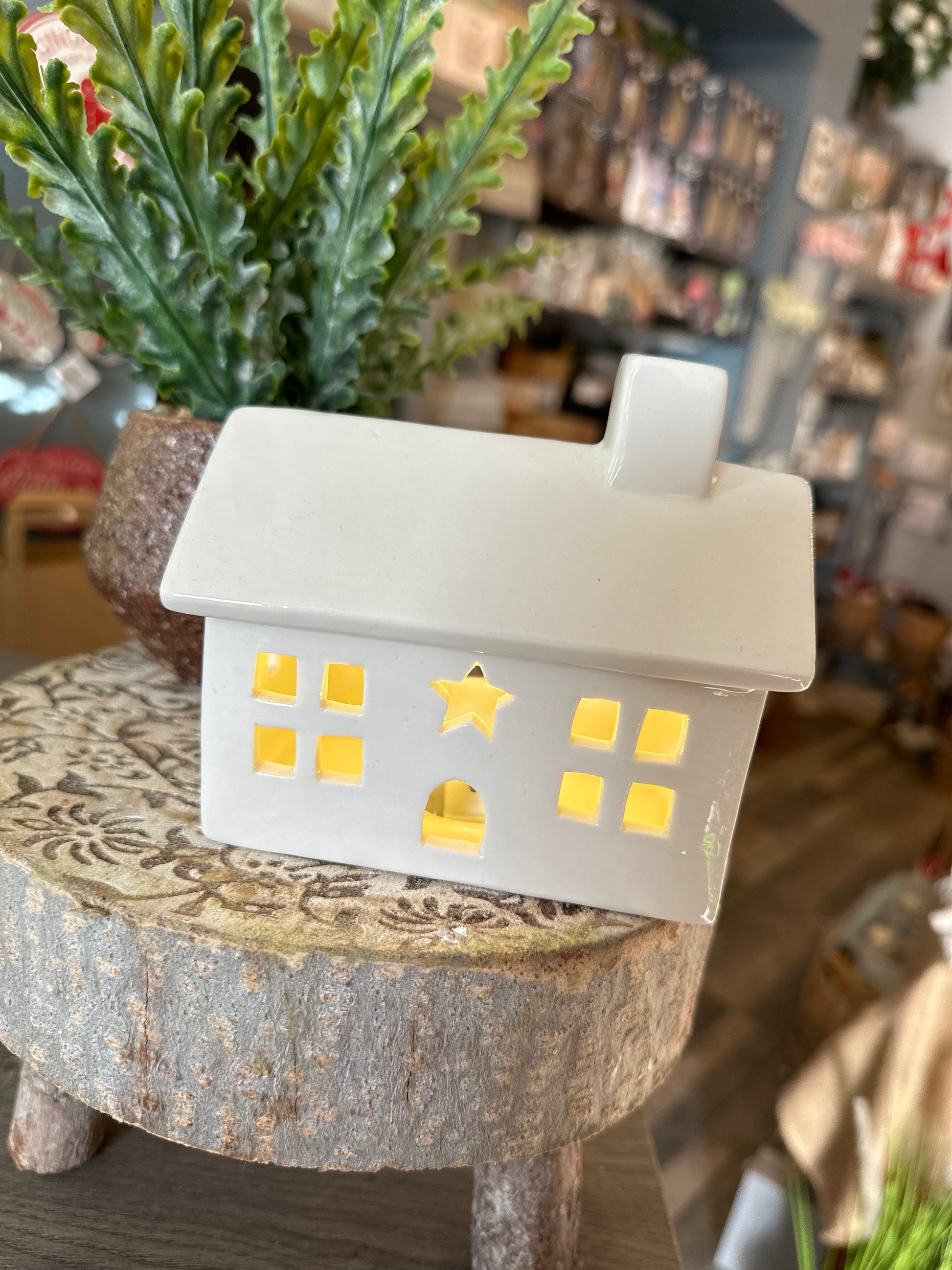 Add a charming touch to your scenes or displays with this Ceramic Light Up House with Star. This cosy little decoration features a warm glowing LED center, perfect for creating a cozy atmosphere. And with its compact size of 12.5cm x 11cm x 8cm, it's easy to place anywhere. Comes with 3*LR44 batteries included.