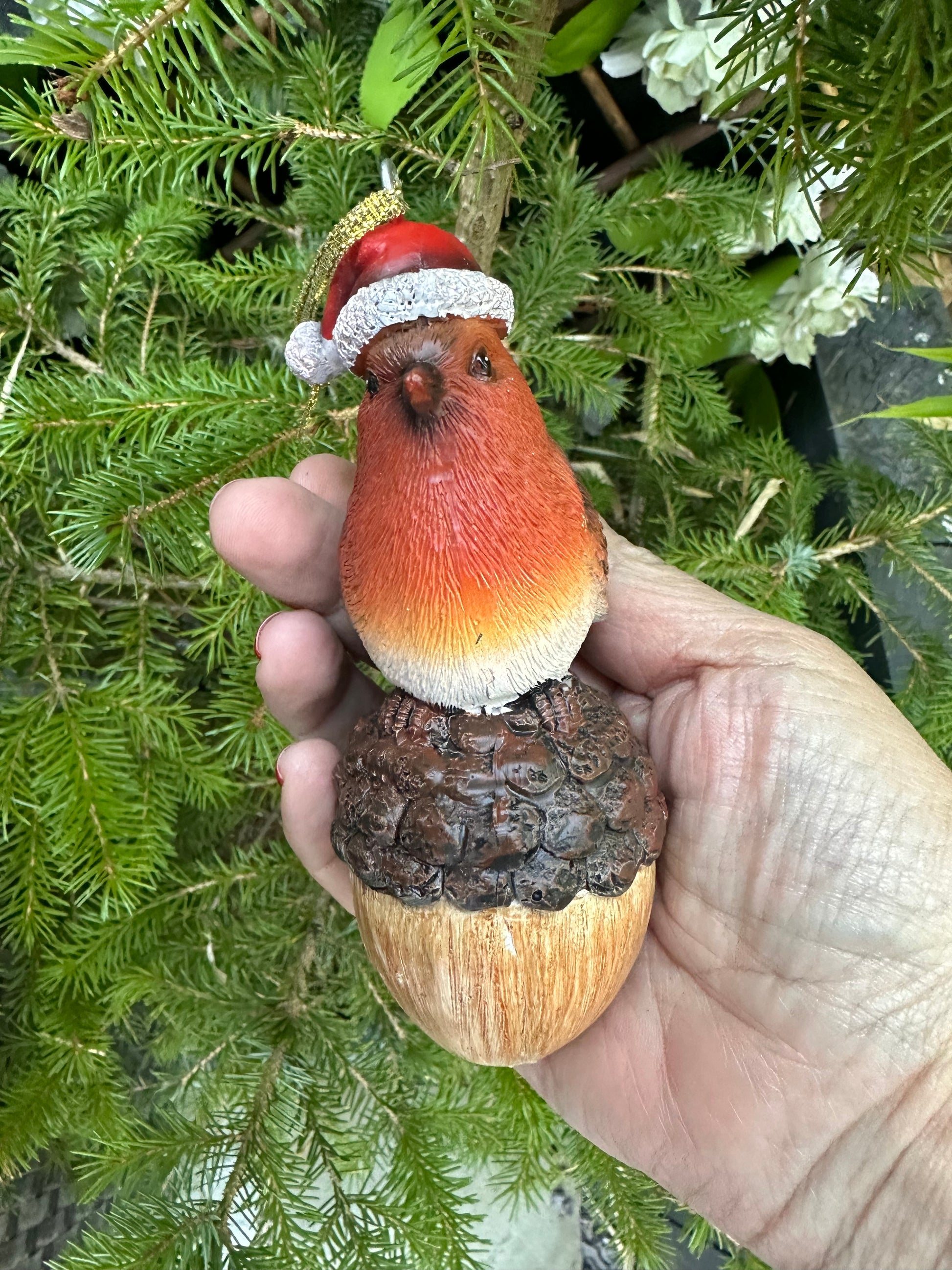 Gorgeous decorative Robin On a acorn hanging on a ribbon to hang on your Christmas tree…