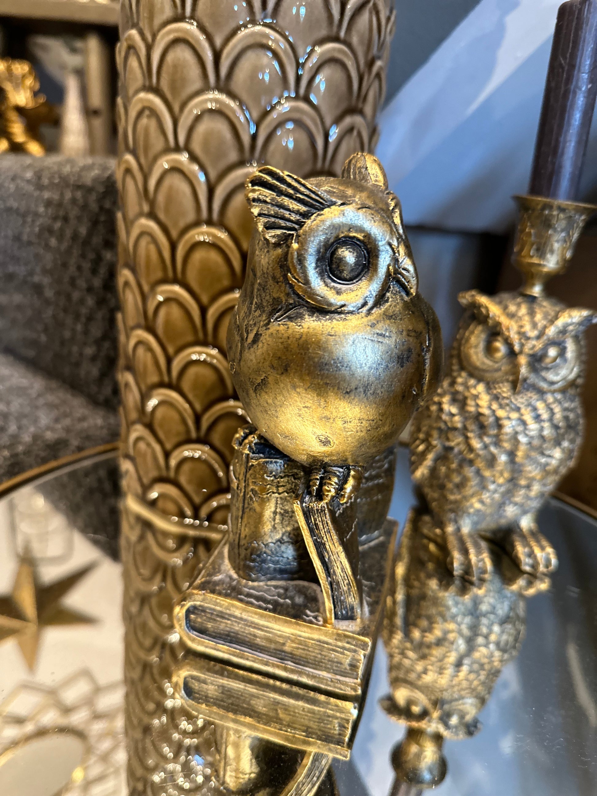 Transform your home with our elegant Gold Decorative Owl Stood on Books. This stunning piece stands at 18cm tall and 8cm wide and deep, adding a touch of sophistication to any room. The gold finish and unique design of an owl standing on books will surely spark conversation and elevate your decor.