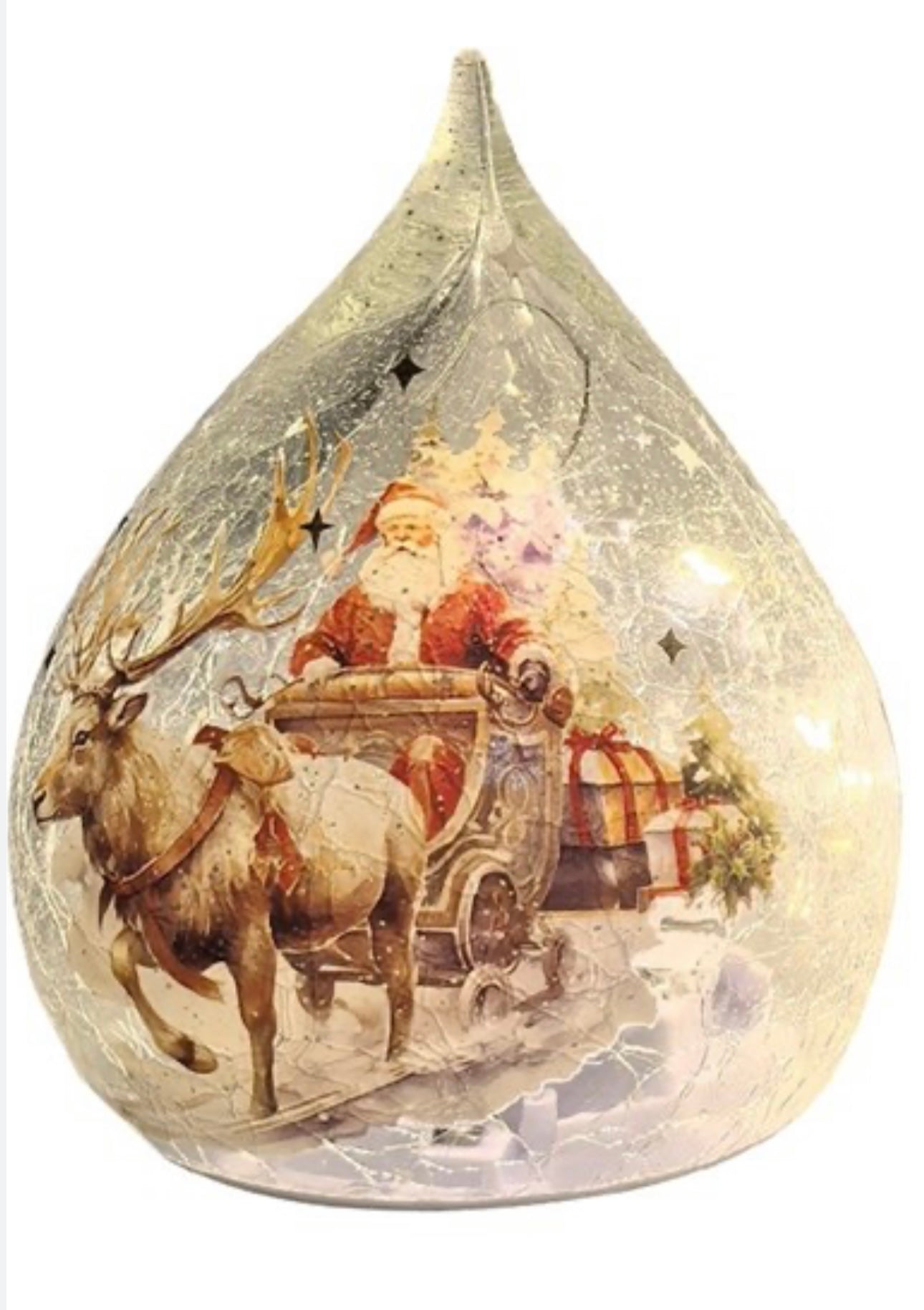 Transform your Christmas décor with our crackle effect glass teardrop decoration featuring Santa on his sleigh. The unique teardrop shape and glowing LED lights create a mesmerizing shimmer effect. At 15cm, this festive addition is perfect for any holiday setup. Battery operated for convenience.