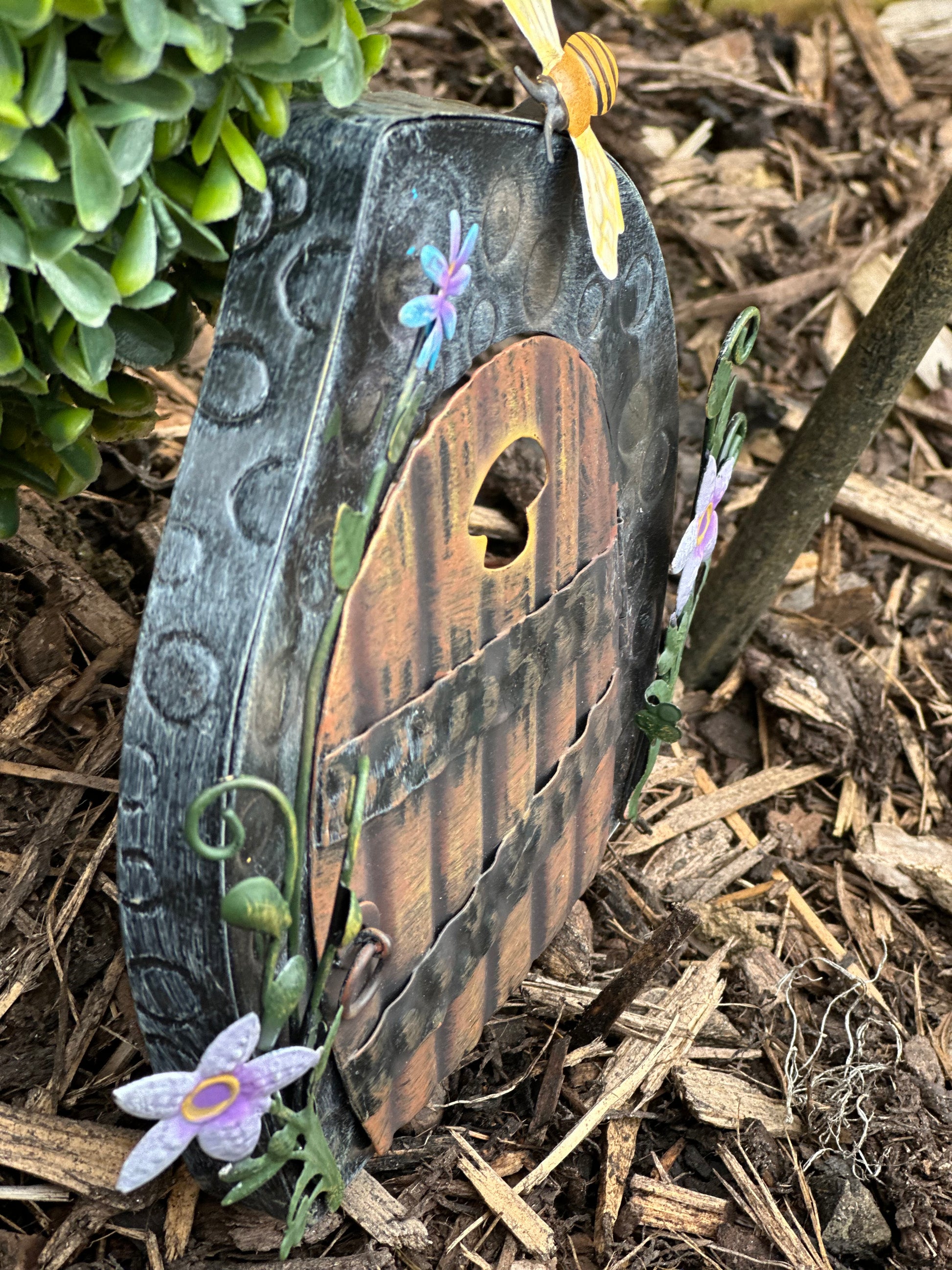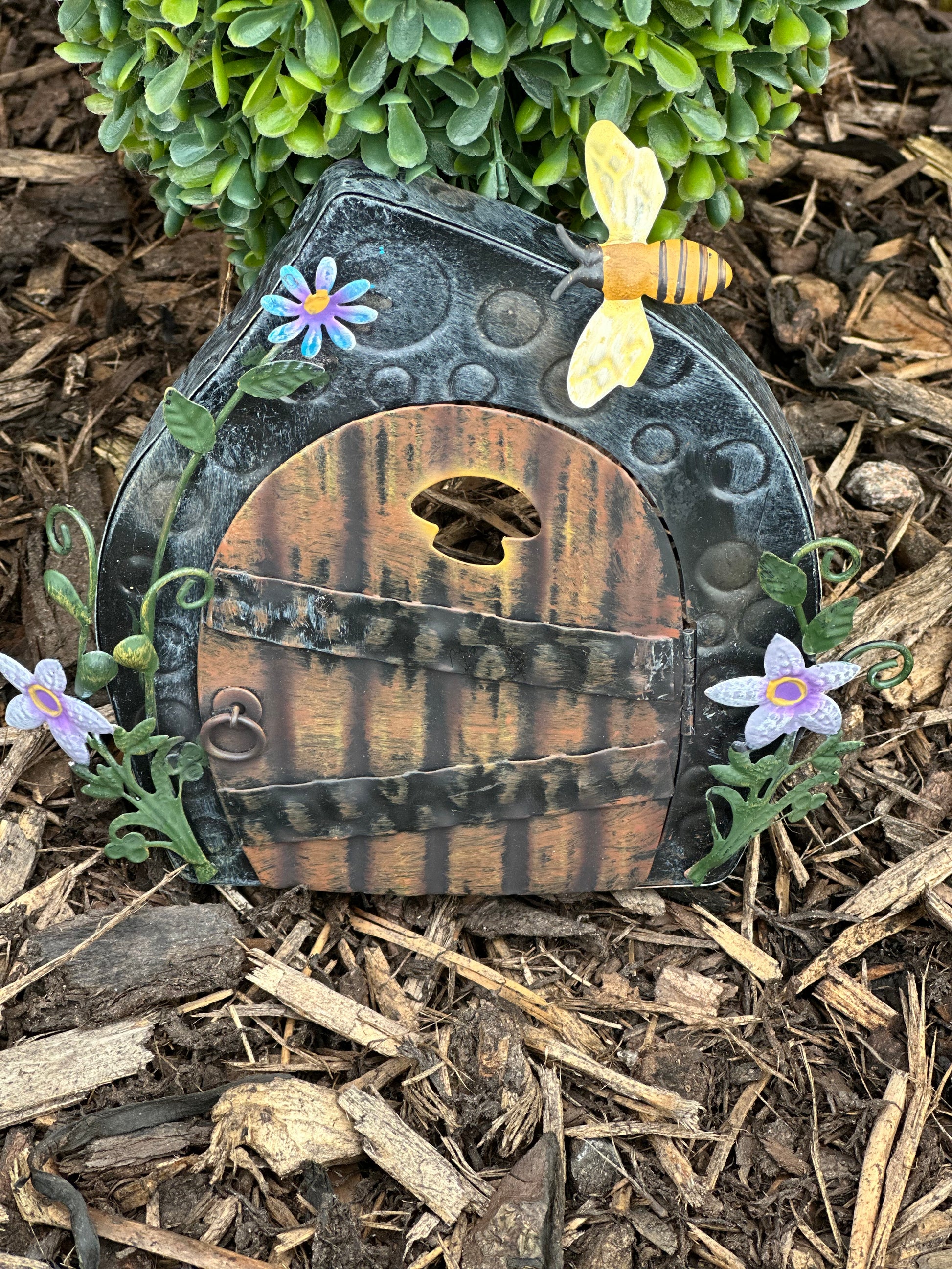 Transform your garden into a whimsical paradise with our Metal Flower Bee Fairy Door! Hand painted and measuring H: 16cm W: 18cm D: 3cm, this playful and charming door will invite magical creatures into your outdoor space. Embrace the magical possibilities with this unique addition.metal fairy door hand painted