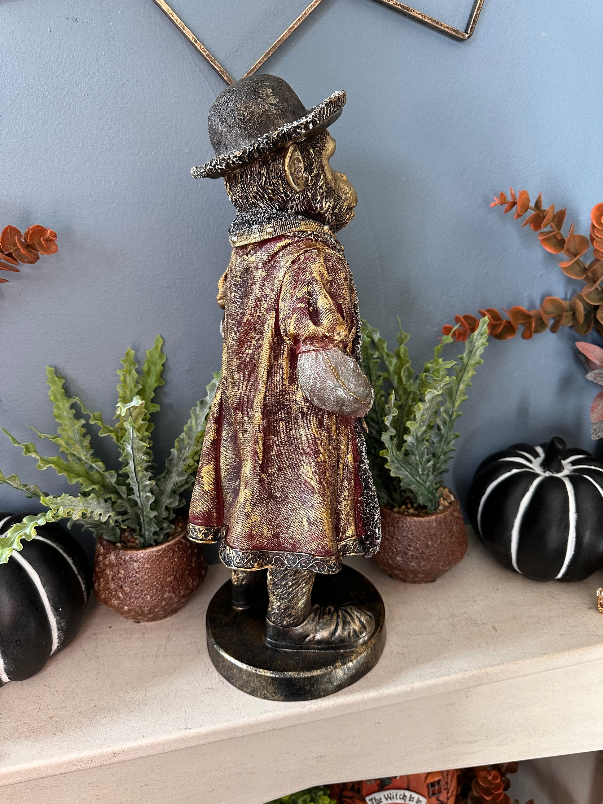 Expertly crafted, this Stunning Decorative Gentleman Monkey stands at H: 43cm with a costume, sword, and intricate detailing, measuring W: 18cm and D: 15cm. Add a touch of elegance and charm to any room with this unique piece.